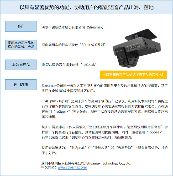 有關東芝語音識別與語音合成的成功導入案例,請參考如下說明。