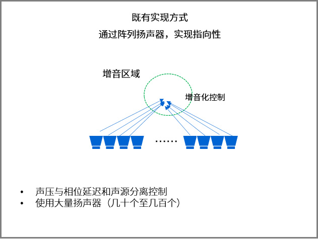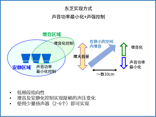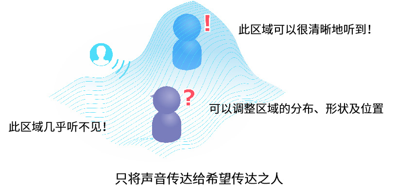 利用音場控制技術,無需特殊硬件,使用三個揚聲器,利用空間聲壓分布可創建聲音輸出清晰的區域和難以聽到的區域。