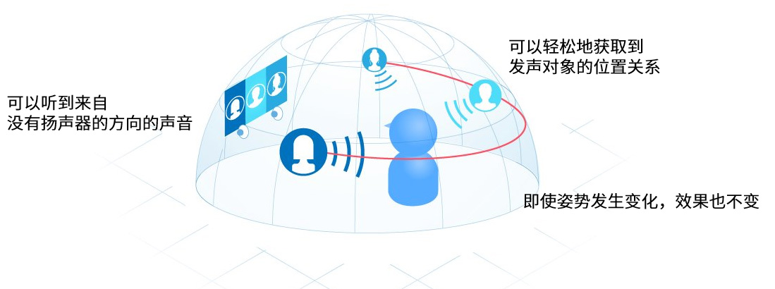 即使用戶在移動,也能保持效果無需佩戴耳機,即可在任意位置聽到有方向性的聲音。例如:通過電視揚聲器和智能手機揚聲器即可享受游戲、應用程序內容的聲音效果。