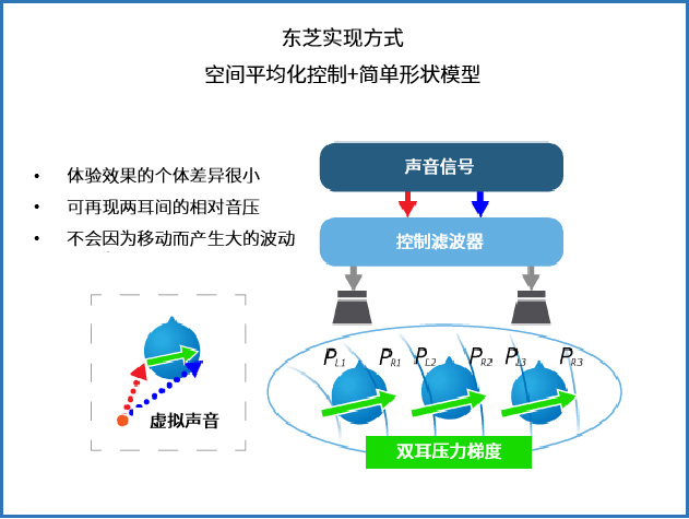 虛擬聲音技術無需特殊的硬件,只需要兩個揚聲器,即可輸出來自任意方向的聲音。作為東芝多年累積的聲學處理技術之一,利用人類感知聲音方向的“雙耳效應”(聲音到達左耳和右耳之間的差異)來實現。