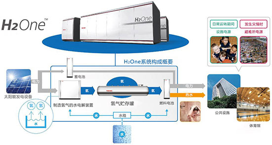 “H2One” 是一個由太陽能發(fā)電設(shè)備、蓄電池、電解水制氫裝置、儲氫罐、燃料電池等組合而成的自給型能源供應(yīng)系統(tǒng),利用太陽能發(fā)電設(shè)備產(chǎn)生的電能將水電解,制成氫氣儲存于儲氫罐中作為燃料電池的燃料,并通過燃料電池提供電力和熱水。因“H2One”系統(tǒng)只需要陽光和水即能運轉(zhuǎn),在發(fā)生災(zāi)害甚至是生命線被切斷的時刻,該系統(tǒng)也可獨立提供電力和熱水。川崎MARIEN作為指定的周邊居民災(zāi)害臨時避難所,一旦發(fā)生災(zāi)害,其所儲存的氫氣可為300人提供約1周左右的電力和熱水。另外,由于“H2One”系統(tǒng)采用了集裝箱式外形,必要時可以用拖車將該系統(tǒng)運往受災(zāi)地區(qū)。