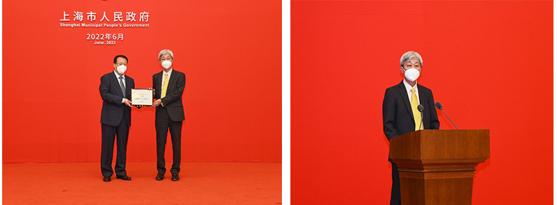 左:上海市委副書記、市長龔正為東芝電梯(中國)有限公司頒發證書 右:東芝電梯(中國)有限公司總經理野杁朗友作為企業代表發言