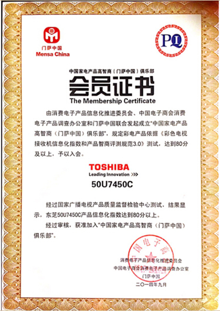 【2014年9月26日】9月24日,中國家電業(yè)盛會——“2014年中國家電產(chǎn)品智商評測結(jié)果發(fā)布會暨高智商(門薩中國)俱樂部成立儀式”在北京舉行。東芝電視-50U7450C在家電產(chǎn)品智能評測中達(dá)到八級標(biāo)準(zhǔn),憑借便捷的操控性、穩(wěn)定的操作系統(tǒng)、強(qiáng)悍的硬件配置而一舉拿下“智能電視專屬智能操作系統(tǒng)卓越體驗獎”。同時,該款產(chǎn)品也成為首批入選中國家電產(chǎn)品高智商(門薩中國)俱樂部成員。