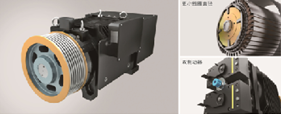 小型化的永磁同步電動機、更節省空間;用電量減少30%以上(與傳統電動機相比);無齒輪曳引式,無需齒輪油,實現低振動低噪音,更為綠色環保;馬達采用集中卷線方式、體積更為小巧,具有高科技的領先水平。