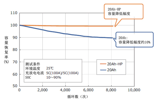由于內阻降低,連續充放電時的發熱量也隨之減少,實現了比能量型20Ah電池更長的使用壽命。例如,經歷8000次充放電循環后,能量型20Ah電池容量下降約10%,而“20Ah-HP電池”容量下降幅度十分微小。*2