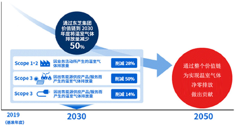 東芝從全球角度(如實現脫碳和循環經濟等)出發,制定了一個全新的長期愿景——東芝集團環境未來愿景2050。東芝的目標是通過整個價值鏈,到2030年度將溫室氣體排放減少50%(與2019年度相比),為2050年實現溫室氣體凈零排放做出貢獻,該目標已獲得SBT的認定。此外,東芝的經營理念是“為了人類和地球的明天”,基于這一理念,東芝將進一步深化環境經營,在“創造豐富價值”的同時,謀求“與地球共生”。