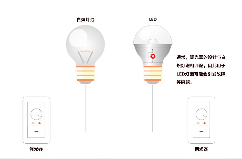 當白熾燈泡與調光器組合時,可適當調暗亮度以使其感覺“不黑但是足夠暗”。 但LED燈泡控制輸出的電流量很小并且非常難控制。