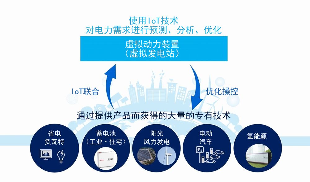 齊藤:東芝已經在相關技術方面取得了較大進展。其中之一便是“虛擬動力裝置”。這是一種使用IoT技術將太陽能、風能、電動汽車、蓄電池等分散的電力結合起來,如同一個發電站一樣運轉的裝置。通過針對性措施,如在省電、負瓦特交易等方面靈活應用IoT和通過AI技術進行分析與電力需求預測,控制各分散電源、消費者端的設備,與用戶共同建立相應機制,提供最佳的電力配給。